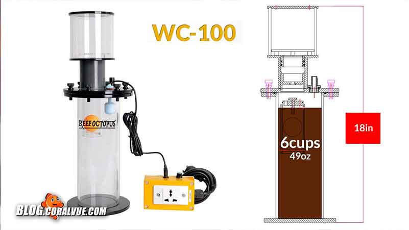 The waste collector comes in two different sizes. A six inch container that can hold up to eighteen cups of skimmate and a four inch container for smaller systems that can hold up to six cups.