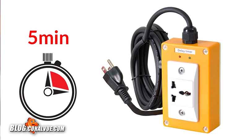 The Reef Octopus delay timer will wait five minutes to turn on the skimmer after power has been restored, allowing the sump to return to normal water levels. If you run an external skimmer, it will prevent recirculation pumps from running dry.